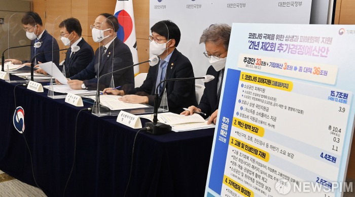 [서울=뉴스핌] 윤창빈 기자 = 홍남기 경제부총리가 지난달 29일 오전 서울 종로구 정부서울청사에서 '2021년 제2회 추가경정예산안'을 브리핑을 하고 있다. 권칠승(오른쪽부터) 중소벤처기업부 장관, 안경덕 고용노동부 장관, 홍 부총리, 권덕철 보건복지부 장관, 이재영 행정안전부 차관. 2021.07.01 pangbin@newspim.com