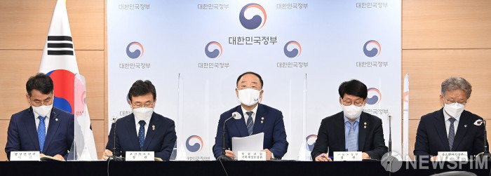 [서울=뉴스핌] 윤창빈 기자 = 홍남기 경제부총리가 지난달 29일 오전 서울 종로구 정부서울청사에서 '2021년 제2회 추가경정예산안'을 브리핑하고 있다. 권칠승(오른쪽부터) 중소벤처기업부 장관, 안경덕 고용노동부 장관, 홍 부총리, 권덕철 보건복지부 장관, 이재영 행정안전부 차관. 2021.07.01 pangbin@newspim.com