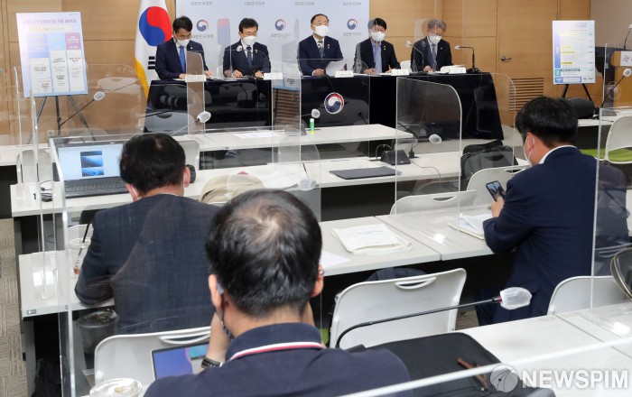 [서울=뉴스핌] 윤창빈 기자 = 홍남기 경제부총리 겸 기획재정부 장관이 지난달 29일 오전 서울 종로구 정부서울청사에서 '2021 제2회 추가경정예산안 브리핑'을 하고 있다. 사진 왼쪽부터 이재영 행정안전부 차관, 권덕철 보건복지부 장관, 홍남기 부총리, 안경덕 고용노동부 장관, 권칠승 중소벤처기업부 장관. 2021.07.01 pangbin@newspim.com