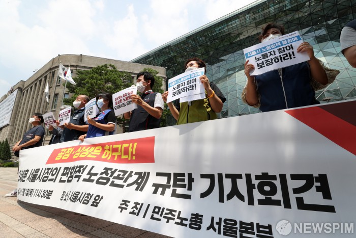 [서울=뉴스핌] 정일구 기자 = 민주노총 서울지역본부 관계자들이 1일 오전 서울 중구 서울시청 앞에서 '공정·상생은 허구다' 오세훈 서울시장의 편향적 노정관계 규탄 기자회견을 하고 있다. 2021.07.01 mironj19@newspim.com