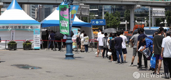 [서울=뉴스핌] 백인혁 기자 = 2일 오후 서울 용산구 서울역 광장에 마련된 코로나19 임시 선별검사소에서 시민들이 검사를 받기 위해 줄을 서고 있다. 중앙방역대책본부는 이날 0시 기준으로 신규 확진자가 826명 늘어나 누적 15만8549명이라고 밝혔다. 신규 확진자 수는 전날(762명)보다 64명 늘어난 수치다. 800명대 신규 확진자는 '3차 대유행'이 정점(작년 12월 25일, 1천240명)을 찍고 내려오던 시점인 올해 1월 7일(869명) 이후 176일 만이다. 2021.07.02 dlsgur9757@newspim.com