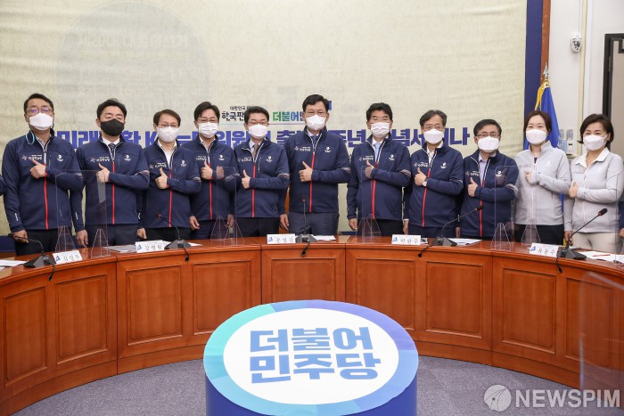 [서울=뉴스핌] 최상수 기자 = 더불어민주당 송영길 대표와 이억원 기획재정부 1차관 등이 5일 국회 당대표실에서 열린 미래전환K-뉴딜위원회 출범 1주년 기념행사에 참석해 기념촬영하고 있다. 2021.07.05 kilroy023@newspim.com