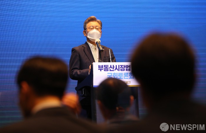 [서울=뉴스핌] 최상수 기자 = 이재명 경기도지사가 6일 오전 서울 여의도 글래드호텔에서 열린 ‘부동산 시장법 제정’ 국회토론회에서 참석하여 환영사를 하고 있다. 2021.07.06 kilroy023@newspim.com