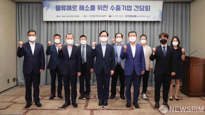 [서울=뉴스핌]강성천 중소벤처기업부 차관은 7일 서울 마포구 가든호텔에서 열린 국제 물류애로 해소를 위한 수출기업 간담회에서 참석자들과 기념촬영을 하고 있다.[사진=중소벤처기업부] 2021.07.07 photo@newspim.com