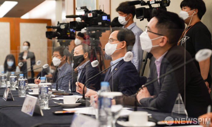 [서울=뉴스핌]강성천 중소벤처기업부 차관은 7일 서울 마포구 가든호텔에서 열린 국제 물류애로 해소를 위한 수출기업 간담회에서 참석자들의 의견을 청취하고 있다.[사진=중소벤처기업부] 2021.07.07 photo@newspim.com