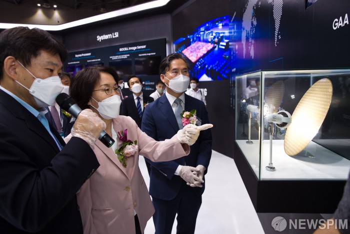 [일산=뉴스핌] 임혜숙 과학기술정보통신부 장관과 박진규 산업통상자원부 차관이 7일 오전 경기도 고양시 일산서구 킨텍스에서 열린 '나노코리아 2021 개막식' 에 참석해 삼성의 'GAA Based 3nm Wafer' 설명을 듣고 있다. [사진=과학기술정보통신부] 2021.07.07 photo@newspim.com