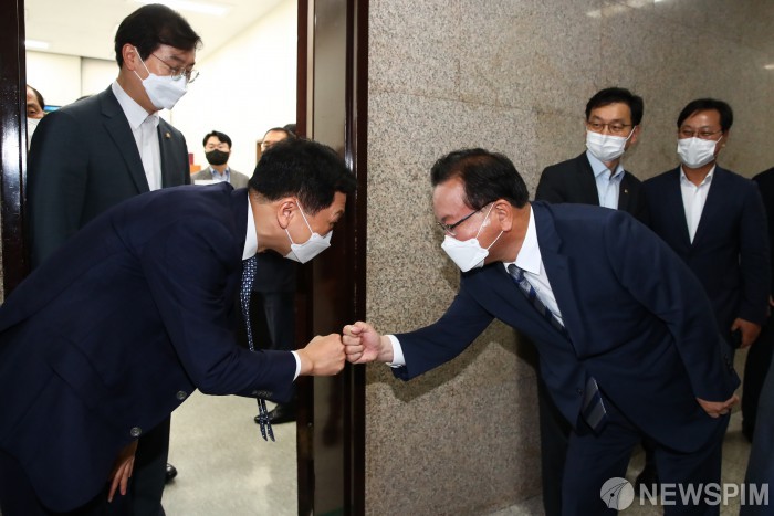 [서울=뉴스핌] 최상수 기자 = 김부겸 국무총리(오른쪽)가 코로나19 확산으로 여야 원내대표들에게 협조를 구하기 위해 8일 국회를 방문해 김기현 원내대표(왼쪽)와 면담을 마친 뒤 원내대표실을 나서며 인사하고 있다. 2021.07.08 kilroy023@newspim.com