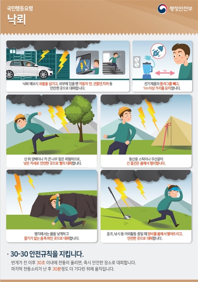 또 야외활동 중 낙뢰가 치면 주변에 큰 나무나 나무 등 높이 솟아있는 곳을 피하고, 물기가 없는 낮고 움푹 파인 곳으로 피해야 한다. 우산이나 지팡이 등 길고 뾰족한 금속을 된 물건은 몸에서 멀리 둬야 한다.