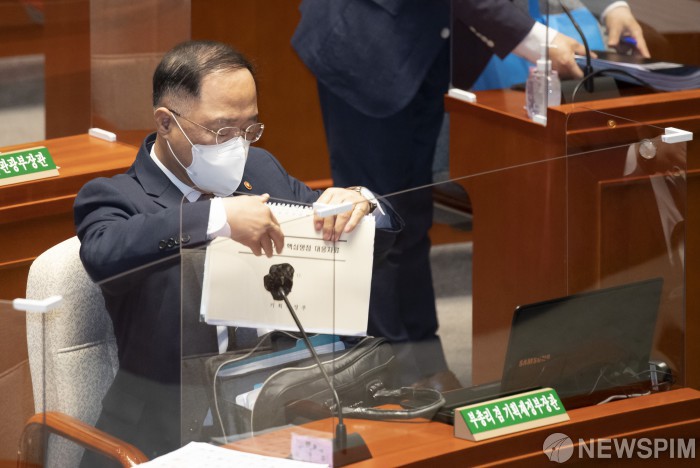 [서울=뉴스핌] 이형석 기자 = 홍남기 부총리 겸 기획재정부 장관이 15일 오전 서울 여의도 국회에서 열린 예산결산특별위원회 전체회의에 참석해 가방에서 자료를 꺼내고 있다. 2021.07.15 leehs@newspim.com