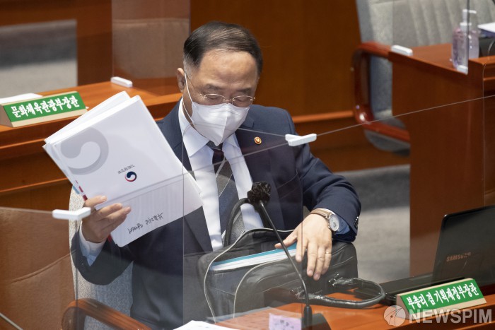 [서울=뉴스핌] 이형석 기자 = 홍남기 부총리 겸 기획재정부 장관이 15일 오전 서울 여의도 국회에서 열린 예산결산특별위원회 전체회의에 참석해 가방에서 자료를 꺼내고 있다. 2021.07.15 leehs@newspim.com