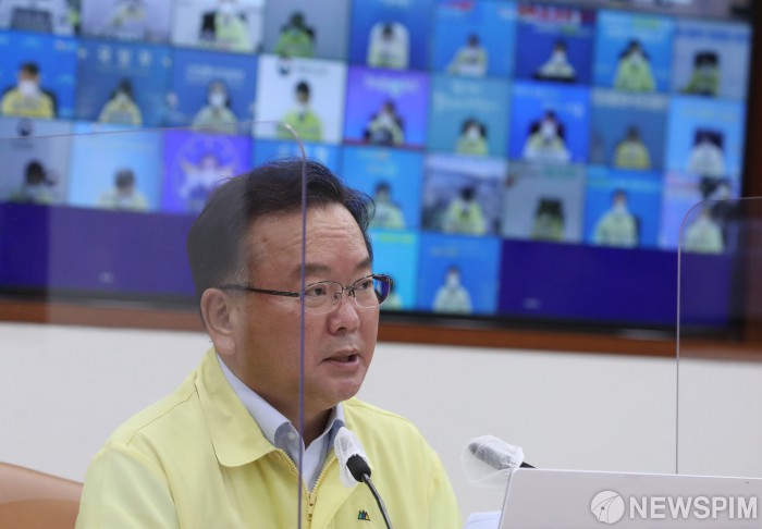 [서울=뉴스핌] 김학선 기자 = 김부겸 국무총리가 18일 서울 종로구 정부서울청사에서 열린 신종 코로나바이러스 감염증(코로나19) 대응 중앙재난안전대책본부회의에서 모두발언을 하고 있다. 김 총리는 이날 회의에서 코로나19의 확산세가 지속되고 있는 것과 관련해 19일부터 비수도권에도 5인 모임 금지를 적용한다고 밝혔다. 2021.07.18 yooksa@newspim.com