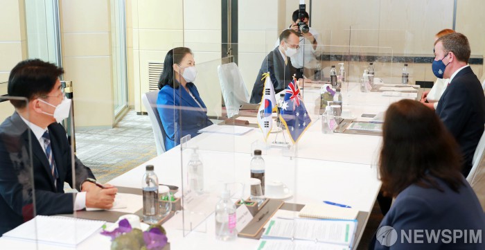 [서울=뉴스핌]유명희 산업통상자원부 통상교섭본부장이 19일 서울 광화문 포시즌스호텔에서 댄 테한(Dan Tehan) 호주 통상장관과 면담에서 발언을 하고 있다.[사진= 산업통상자원부 ] 2021.07.19 photo@newspim.com