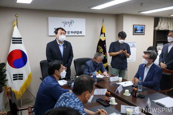[대구=뉴스핌] 윤석열 전 검찰총장이 20일 대구 중구 서문시장 상가연합회 사무실에서 상인과 간담회를 열고 있다. [사진=윤석열 캠프] 2021.07.20 photo@newspim.com