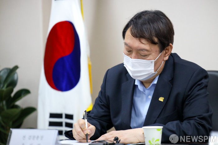 [대구=뉴스핌] 윤석열 전 검찰총장이 20일 대구 중구 서문시장 상가연합회 사무실에서 상인과 간담회를 열고 있다. [사진=윤석열 캠프] 2021.07.20 photo@newspim.com
