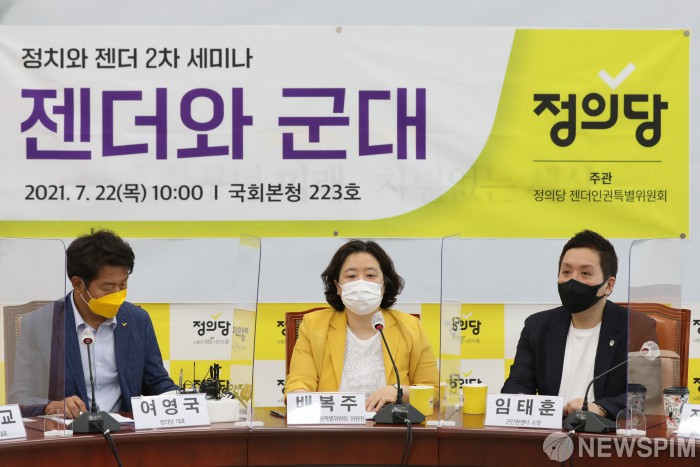 [서울=뉴스핌] 이형석 기자 = 배복주 정의당 젠터인권특별위원회 위원장이 22일 오전 국회에서 정치와 젠더 2차 세미나 '젠더와 군대'에서 발언하고 있다. 2021.07.22 leehs@newspim.com