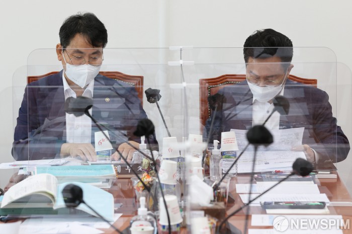 [서울=뉴스핌] 이형석 기자 = 22일 국회에서 열린 제3차 예산결산특별위원회 2021년도 제2회 추경예산안 등 조정소위원회에 참석한 행정안전부 이재영 차관(왼쪽)과 고규창 기획조정실장이 회의시작에 앞서 자료를 확인하고 있다. 2021.07.22 leehs@newspim.com