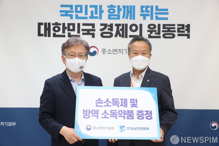 [세종=뉴스핌] 권칠승 중소벤처기업부 장관이 27일 세종청사에서 코로나19 확산 방지를 위한 방역 물품을 정동식 전국상인연합회장에게 전달하고 있다. [사진=중소벤처기업부] 2021.07.27 photo@newspim.com
