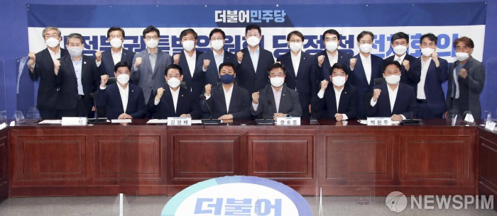 [서울=뉴스핌] 이형석 기자 = 윤호중 더불어민주당 원내대표(아래 오른쪽 세번째)가 28일 국회 의원회관에서 열린 '재정분권특별위원회 당,정,청 전체회의'에 앞서 참석자들과 기념사진을 찍고 있다. 2021.07.28 leehs@newspim.com