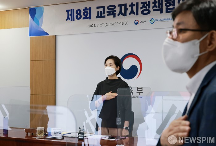 [서울=뉴스핌] 유은혜 사회부총리 겸 교육부 장관이 지난 27일 정부세종청사에서 열린 '제8회 교육자치정책협의회'에서 국민의례를 하고 있다. [사진=교육부] 2021.07.28 photo@newspim.com