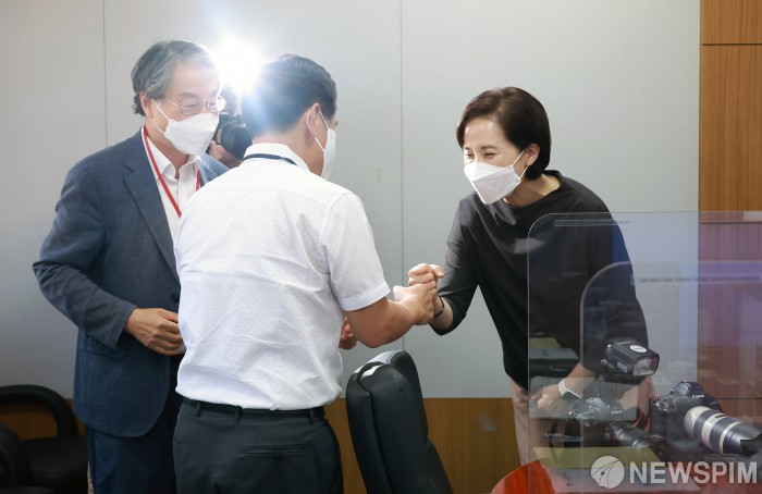 [서울=뉴스핌] 유은혜 사회부총리 겸 교육부 장관이 지난 27일 정부세종청사에서 열린 '제8회 교육자치정책협의회'에서 참석자와 인사를 나누고 있다. [사진=교육부] 2021.07.28 photo@newspim.com