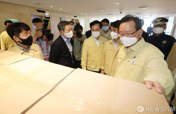 [인천=뉴스핌] 윤창빈 기자 = 김부겸 국무총리가 29일 오전 코로나19 방역현장점검을 위해 인천시 서구 하나글로벌 생활치료센터를 방문해 1인용 입소자 생활용품을 살펴보고 있다. 2021.07.29 pangbin@newspim.com