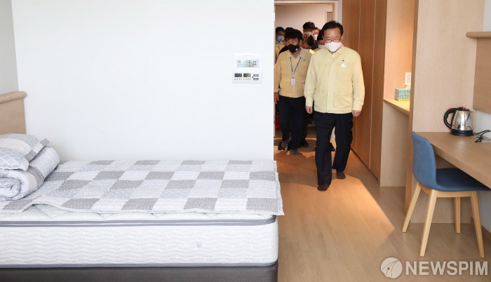 [인천=뉴스핌] 윤창빈 기자 = 김부겸 국무총리가 29일 오전 코로나19 방역현장점검을 위해 인천시 서구 하나글로벌 생활치료센터를 방문해 센터 내부를 살펴보고 있다. 2021.07.29 pangbin@newspim.com