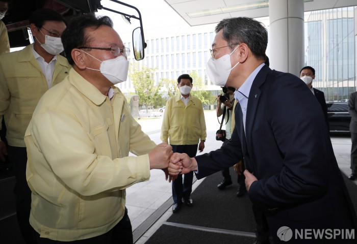 [인천=뉴스핌] 윤창빈 기자 = 김부겸 국무총리가 29일 오전 코로나19 방역현장점검을 위해 인천시 서구 하나글로벌 생활치료센터를 방문해 박성호 하나은행장과 주먹 인사를 나누고 있다. 2021.07.29 pangbin@newspim.com