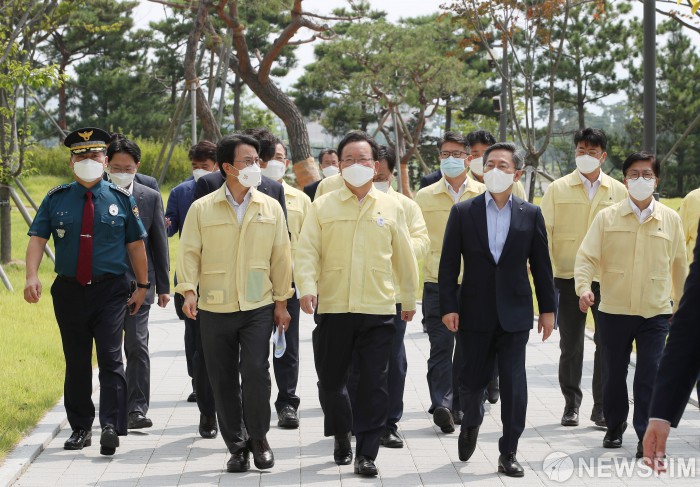 [인천=뉴스핌] 윤창빈 기자 = 김부겸 국무총리가 29일 오전 코로나19 방역현장점검을 위해 인천시 서구 하나글로벌 생활치료센터를 방문하고 있다. 2021.07.29 pangbin@newspim.com