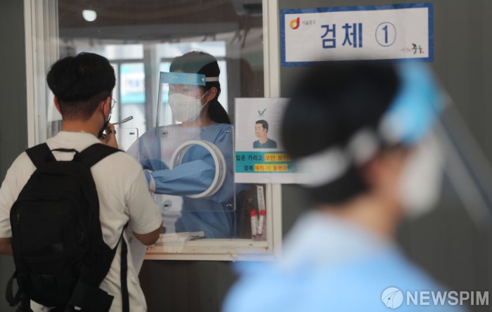 [서울=뉴스핌] 김학선 기자 = 코로나19 신규 확진자가 1725명 발생하며 29일째 1천명대를 이어가고 있는 4일 서울역 광장에 마련된 코로나19 임시 선별검사소에서 시민들이 검사를 받고 있다. 정부는 확진자 추이를 면밀히 지켜보고 현재 시행 중인 사회적 거리두기(수도권 4단계, 비수도권 3단계) 조치 연장 여부를 오는 6일 결정한다. 2021.08.04 yooksa@newspim.com