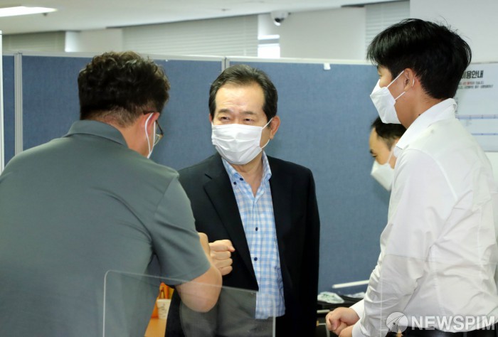 [서울=뉴스핌] 이형석 기자 = 정세균 더불어민주당 대선 예비후보가 6일 오전 서울 여의도 용산빌딩에서 열린 '스타트업 기업인들과의 대화'에서 참석자들과 인사를 하고 있다. 2021.08.06 leehs@newspim.com
