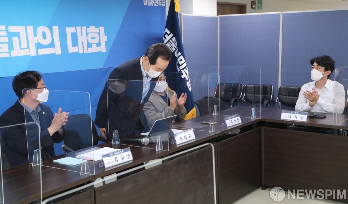 [서울=뉴스핌] 이형석 기자 = 정세균 더불어민주당 대선 예비후보가 6일 오전 서울 여의도 용산빌딩에서 열린 '스타트업 기업인들과의 대화'에서 참석자들과 인사를 하고 있다. 2021.08.06 leehs@newspim.com