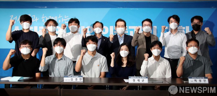 [서울=뉴스핌] 이형석 기자 = 정세균 더불어민주당 대선 예비후보가 6일 오전 서울 여의도 용산빌딩에서 열린 '스타트업 기업인들과의 대화'에서 참석자들과 기념촬영을 하고 있다. 2021.08.06 leehs@newspim.com