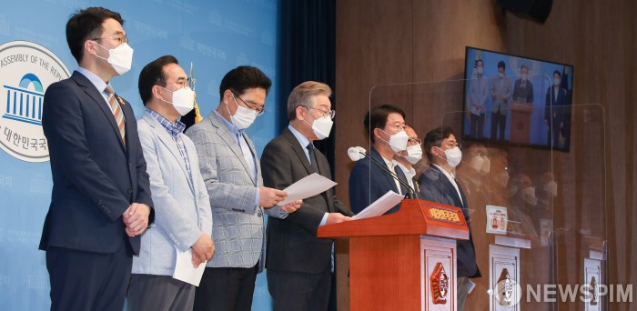 [서울=뉴스핌] 최상수 기자 = 더불어민주당 대선 경선후보인 이재명 경기도지사가 8일 오전 서울 여의도 국회 소통관에서 민주당 경선 과정 격화되는 네거티브 공방을 중단하겠다고 밝히는 기자회견을 갖고 있다. 2021.08.08 kilroy023@newspim.com