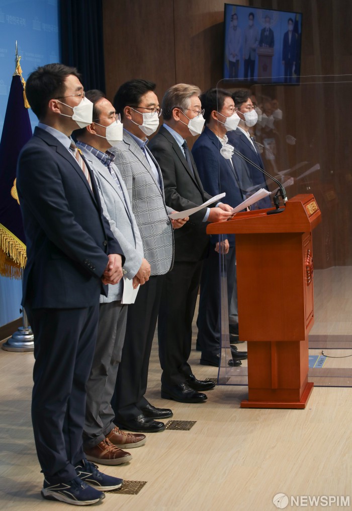 [서울=뉴스핌] 최상수 기자 = 더불어민주당 대선 경선후보인 이재명 경기도지사가 8일 오전 서울 여의도 국회 소통관에서 민주당 경선 과정 격화되는 네거티브 공방을 중단하겠다고 밝히는 기자회견을 갖고 있다. 2021.08.08 kilroy023@newspim.com