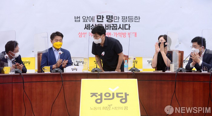 [서울=뉴스핌] 이형석 기자 = 한상균 전 민주노총 위원장10일 오전 서울 여의도 국회에서 열린 정의당 대선준비단 연속세미나 '직설청취 2022 대선과 정의당'에 참석해 인사를 하고 있다. 2021.08.10 leehs@newspim.com
