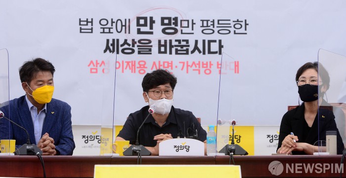 [서울=뉴스핌] 이형석 기자 = 한상균 전 민주노총 위원장(가운데)이 10일 오전 서울 여의도 국회에서 열린 정의당 대선준비단 연속세미나 '직설청취 2022 대선과 정의당'에서 발언을 하고 있다. 2021.08.10 leehs@newspim.com