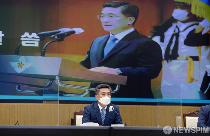 [서울=뉴스핌] 서 욱 국방부장관이 11일 오전 국방부 대회의실에서 열린 제8회 방위산업발전협의회에서 인사말을 하고 있다.[사진=산업통상자원부] 2021.08.11 photo@newspim.com