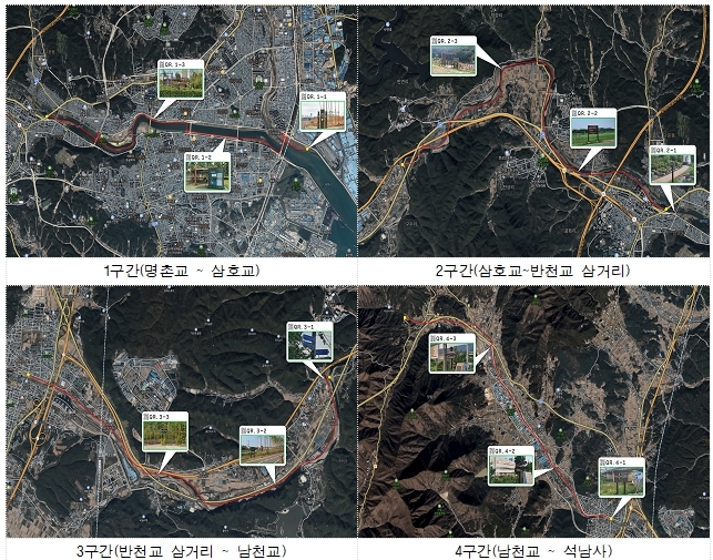 큐아르(QR)코드 팻말은 명촌교~십리대숲~선바위~석남사를 크게 4구간으로 나눠 한 구간당 3개씩, 명촌교 하부 백리대숲 시작점에서 울주군 상북면 농공교 부근까지 모두 12개가 있다.