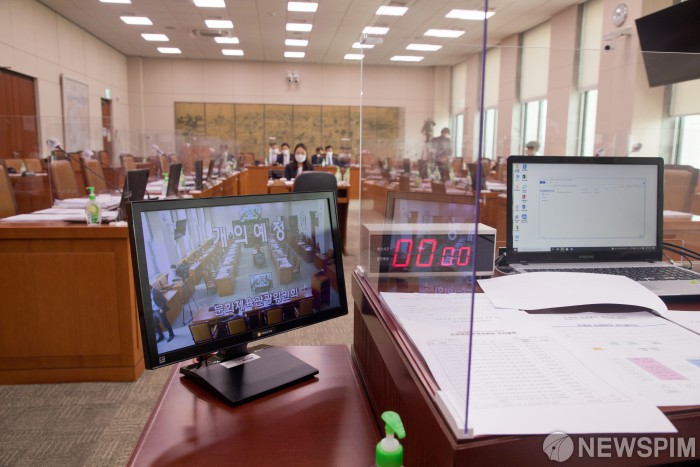 [서울=뉴스핌] 이형석 기자 = 황희 장관과 오영우 제1차관이 12일 오전 국회에서 문화체육관광위원회 전체회의 개회를 기다리고 있다. 2021.08.12 leehs@newspim.com