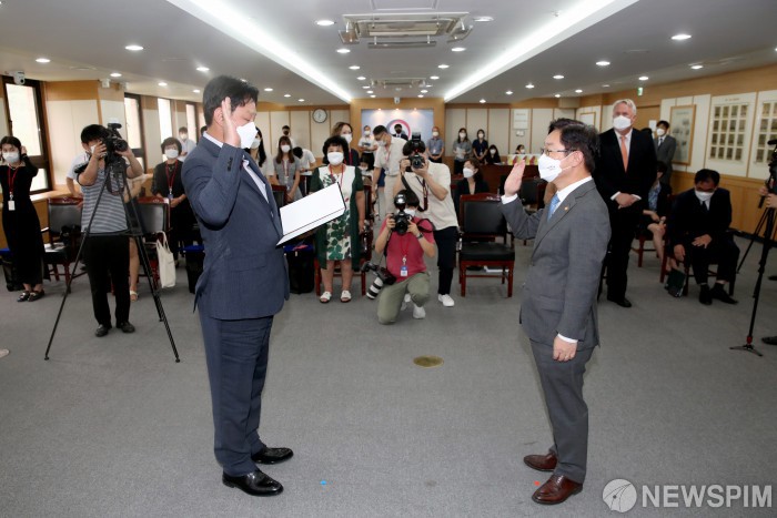 [과천=뉴스핌] 정일구 기자 = 12일 오전 경기 과천시 정부과천청사 법무부 대회의실에서 열린 독립유공자 후손 국적증서 수여식에서 심용준 선생 후손 심세영씨가 박범계 법무부 장관 앞에서 국민선서를 하고 있다. 2021.08.12 mironj19@newspim.com