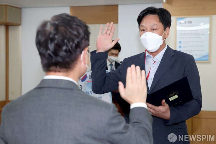 [과천=뉴스핌] 정일구 기자 = 12일 오전 경기 과천시 정부과천청사 법무부 대회의실에서 열린 독립유공자 후손 국적증서 수여식에서 심용준 선생 후손 심세영씨가 박범계 법무부 장관 앞에서 국민선서를 하고 있다. 2021.08.12 mironj19@newspim.com