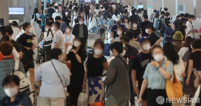 [서울=뉴스핌] 김학선 기자 = 광복절 연휴를 앞둔 13일 오후 서울 강서구 김포공항 국내선 청사가 여행객들로 붐비고 있다. 최근 코로나19 신규 확진자가 2000명대에 육박하며 확산세가 지속되자 정부는 이날 대국민 담화를 통해 "연휴기간 모임과 이동을 최소화해 달라"고 호소했다. 2021.08.13 yooksa@newspim.com