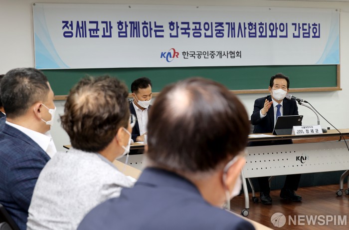 [서울=뉴스핌] 국회사진취재단 = 정세균 더불어민주당 대선 경선 후보가 13일 오후 서울 관악구 한국공인중개사협회를 방문해 간담회에서 부동산중개업 현안과 제도 개선에 대해 이야기를 나누고 있다. 2021.08.13 photo@newspim.com