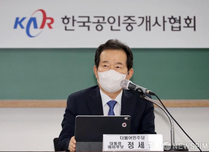 [서울=뉴스핌] 국회사진취재단 = 정세균 더불어민주당 대선 경선 후보가 13일 오후 서울 관악구 한국공인중개사협회를 방문해 간담회에서 부동산중개업 현안과 제도 개선에 대해 이야기를 나누고 있다. 2021.08.13 photo@newspim.com