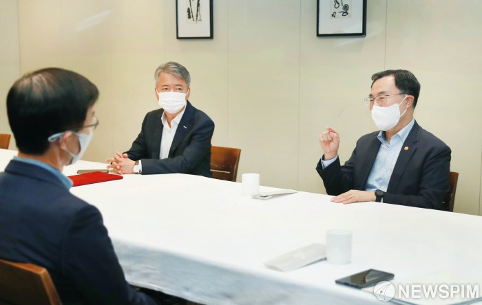 [서울=뉴스핌] 문승욱 산업통상자원부 장관이 13일 서울시청 인근 한식당에서 이인호 무역보험공사 사장, 방문규 수출입은행장이 참석한 가운데 열린 무역 정책금융기관장 간담회에서 발언을 하고 있다.[사진=산업통상자원부] 2021.08.13 photo@newspim.com