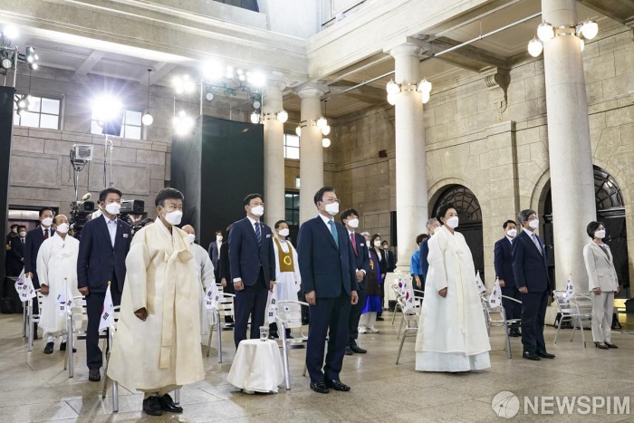 [서울=뉴스핌] 문재인 대통령이 15일 오전 서울시 중구 문화역서울 284에서 열린 제76주년 광복절 경축식에서 애국가를 제창하고 있다.[사진=청와대] 2021.08.15 photo@newspim.com