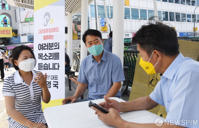 [서울=뉴스핌] 국회사진취재단 = 여영국 정의당 대표(오른쪽)가 16일 오후 서울 종로구 청계천 전태일다리에서 대체휴일임에도 쉬지 못하는 청계천 봉제 노동자들의 고충을 청취하고 있다. 2021.08.16 photo@newspim.com