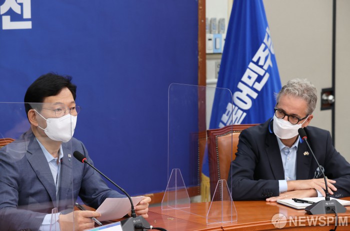 [서울=뉴스핌] 최상수 기자 = 송영길 더불어민주당 대표가 17일 오전 서울 여의도 국회에서 야콥 할그렌(Jakob Hallgren) 주한 스웨덴 대사를 접견, 인사말을 하고 있다. 2021.08.17 kilroy023@newspim.com