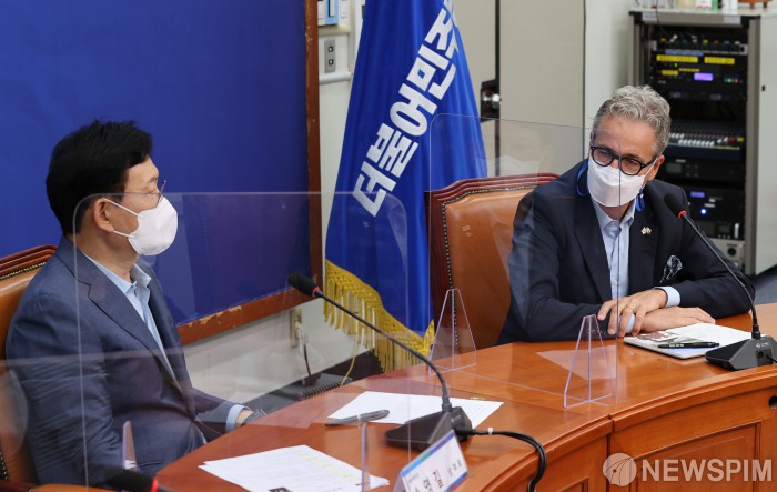 [서울=뉴스핌] 최상수 기자 = 야콥 할그렌(Jakob Hallgren) 주한 스웨덴 대사가 17일 오전 서울 여의도 국회 에서 송영길 더불어민주당 대표를 접견, 인사말을 하고 있다. 2021.08.17 kilroy023@newspim.com