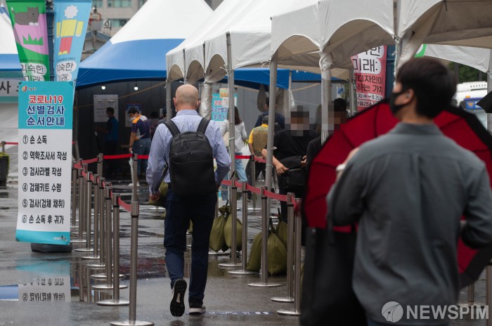[서울=뉴스핌] 윤창빈 기자 = 18일 오전 서울 중구 서울역광장에 마련된 코로나19 임시선별검사소에서 시민들이 검사를 받기위해 줄을 서고 있다. 중앙방역대책본부는 18일 0시 누적 확진자는 전날보다 1천805명 늘어난 22만8천657명이라고 밝혔다. 신규 확진자는 전날(1천373명)보다 432명 늘면서 지난 15일(1천816명) 이후 3일 만에 다시 1천800명대를 기록했다. 2021.08.18 pangbin@newspim.com